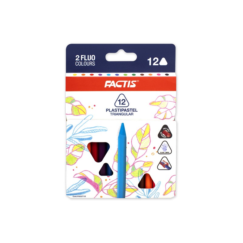 10 Plastipastel värvipliiatsit põhivärvides ja 2 fluorestseerivat värvi. Kolmnurkne kuju. Uus koostis: sujuvam ja paremini katv joon. Plastipastel pliiatsid on puhtad ja vastupidavad värvipliiatsid, mis sobivad ideaalselt väikelastele. Kolmnurkse ja kergelt ümara osaga disain sobib ideaalselt koolilaste kätte ja hoiab ära pliiatsite veeremise üle tööpindade. 3 erinevat joont: pliiatsi otsaga saab tõmmata peeneid jooni, otsaga saab tõmmata pakse jooni ja suuremaid alasid saab varjutada kogu pliiatsi pikkusega.