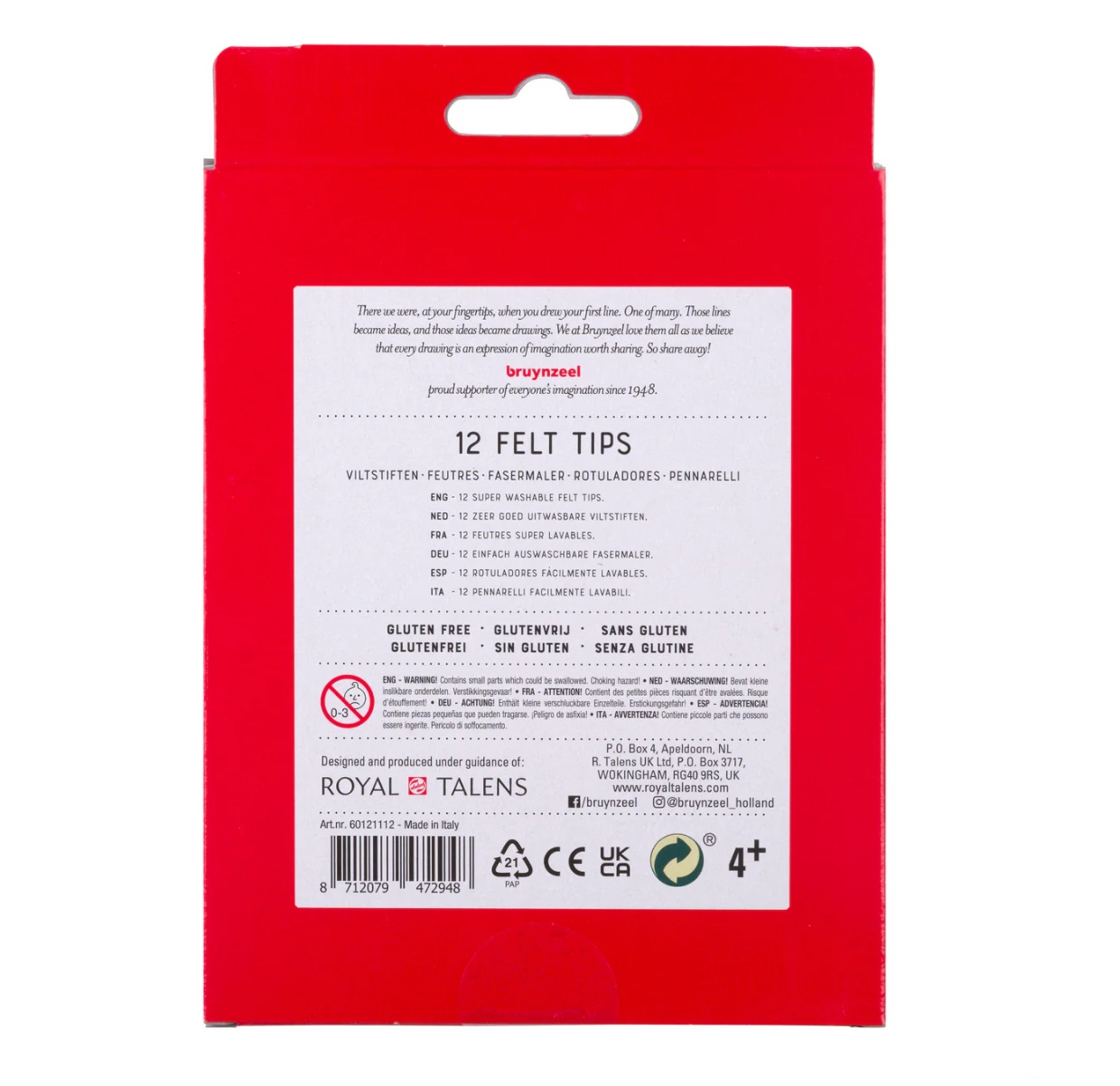 Kvaliteetsete Bruynzelli viltpliiatsitega saad teha kauneimaid joonistusi ja värvida kauneimaid värvimislehti! Kui sa pole viltpliiatseid mõnda aega kasutanud ja need on veidi kuivanud, anna neile teine elu, kastes need vette. See komplekt sisaldab 12 populaarseimat värvi. Sobib lastele alates 4. eluaastast. Omadused: - Hea värviedastusvõime. - Veepõhine tint. - Enamikult tekstiilidelt kergesti mahapestav. - Gluteenivaba.