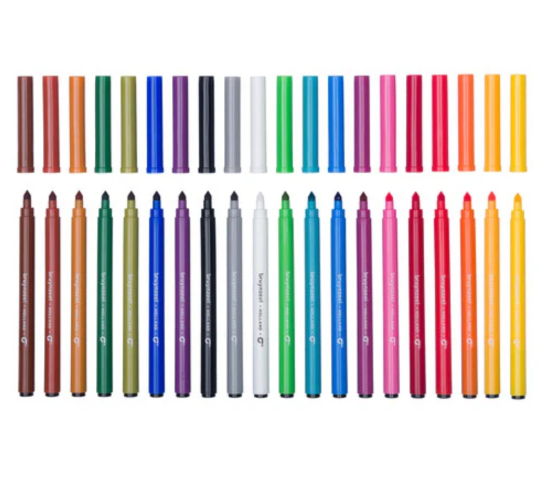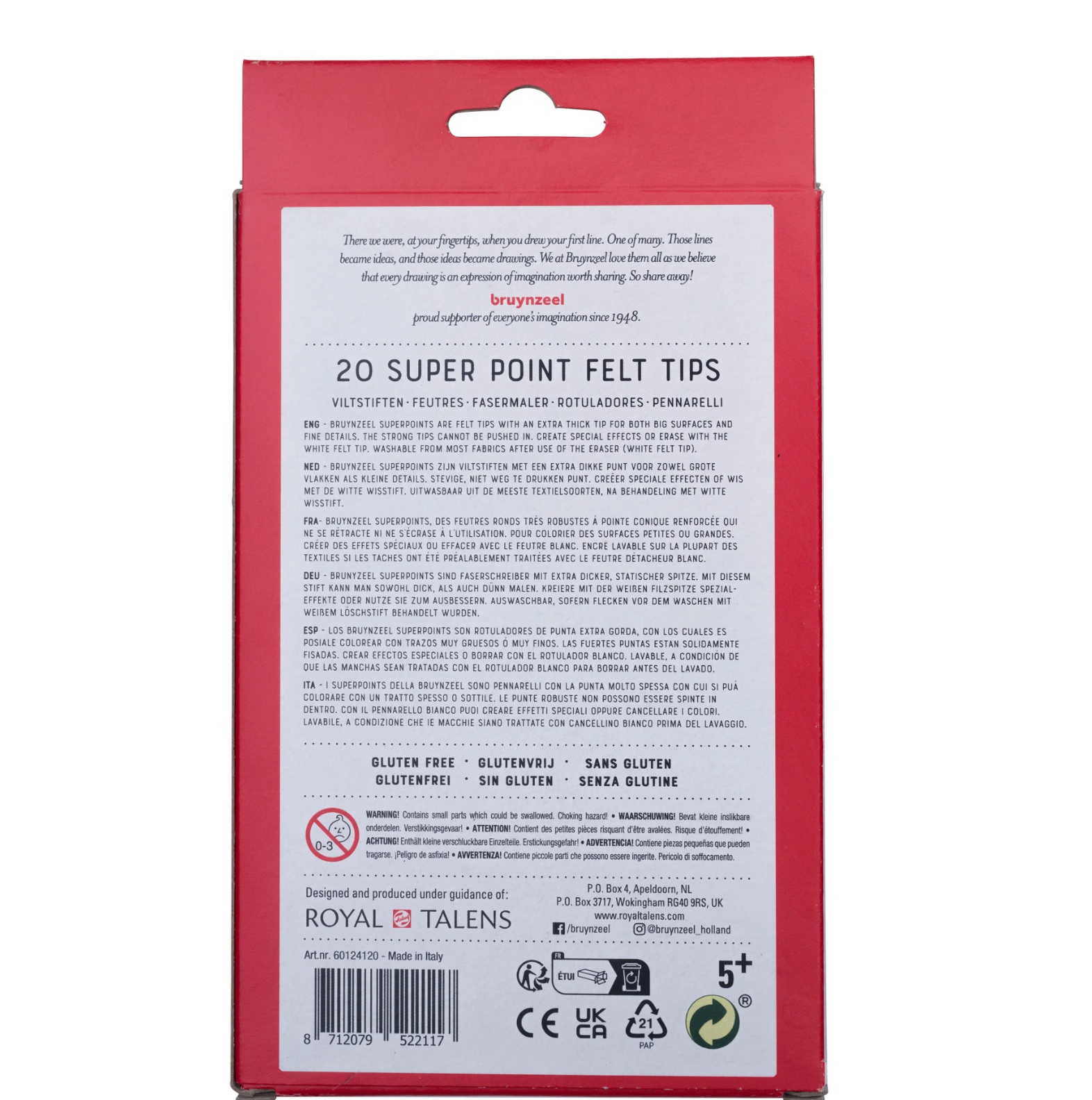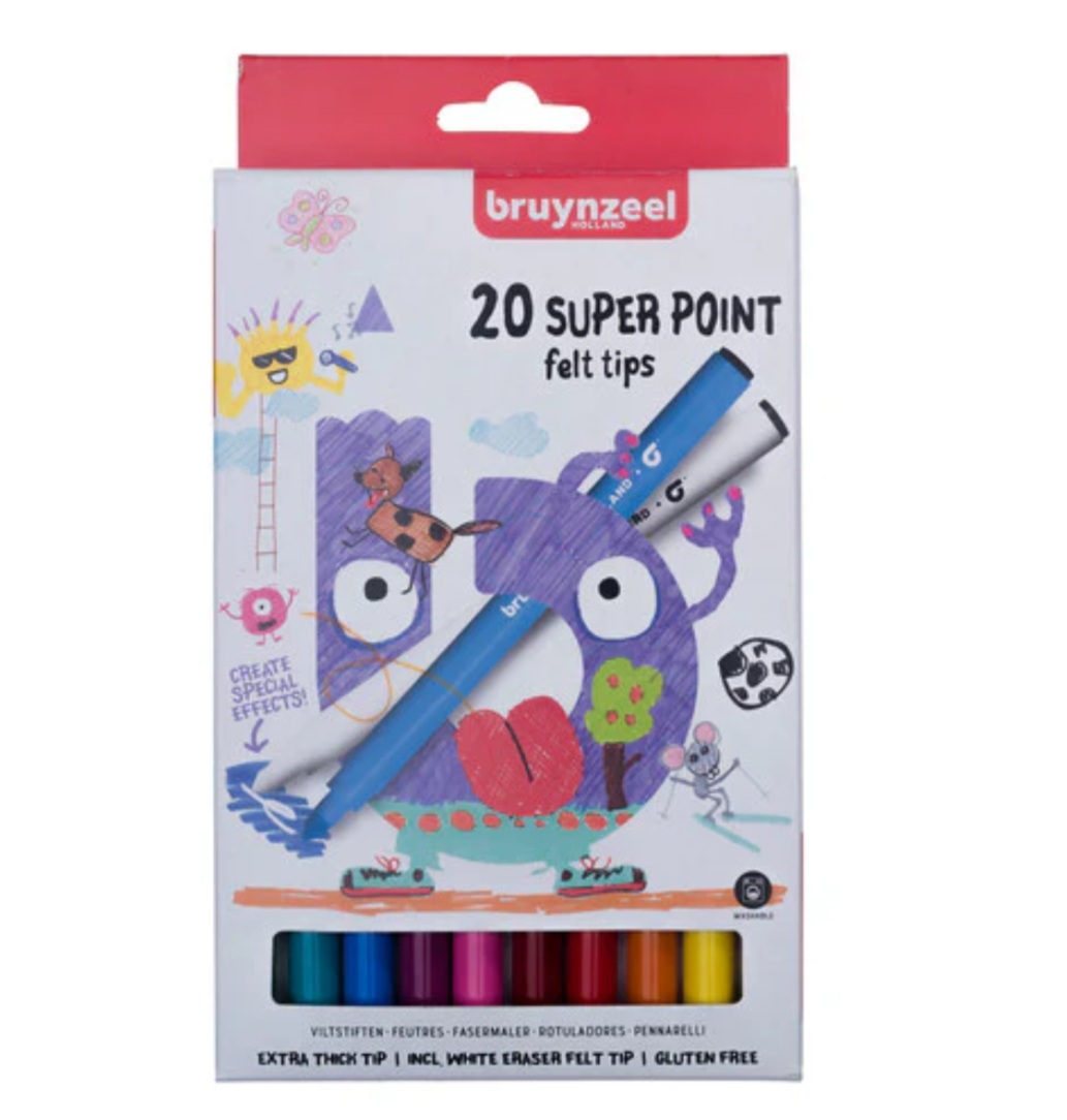 Bruynzeeli Super Point- Superots viltpliiatsid ei tohiks puududa ühegi väikese loomingulise inimese meisterdamiskohvrist! Kasuta valget viltpliiatsit et värvilised alad uuesti valgeks muuta, mis on kasulik, kui oled joontest väljapoole värvinud. Või loo salakood, luues esmalt valge viltpliiatsiga teksti või joonistuse, mida keegi ei näe. Kui sa hiljem värviliste viltpliiatsitega üle joonistad, ilmub tekst või joonistus võluväel välja (sest see jääb valgeks)! Samuti väga mugav: valge vilpliiatsiga saad tekstiilidelt jmt vajadusel plekke hõlpsalt kustutada. Vilpliitasite tint on nahalt mahapestav ja seda saab enamikult tekstiilidelt maha pesta (pärast eeltöötlust valge vildikaga). Pakend sisaldab 19 erinevat värvi vildikat ja valge viltpliiatsi. Sobib lastele alates 5. eluaastast.