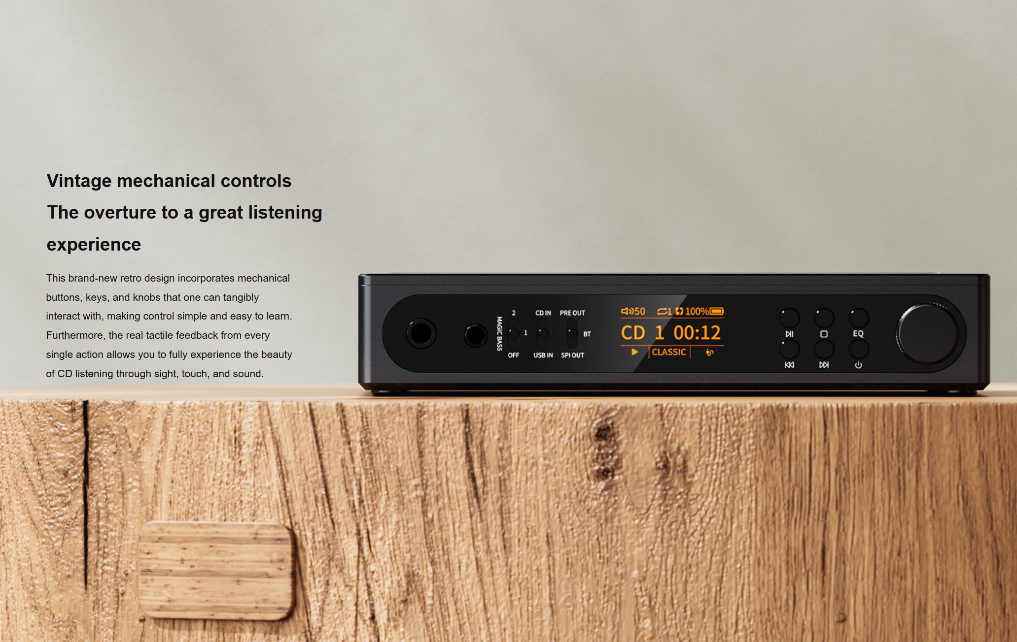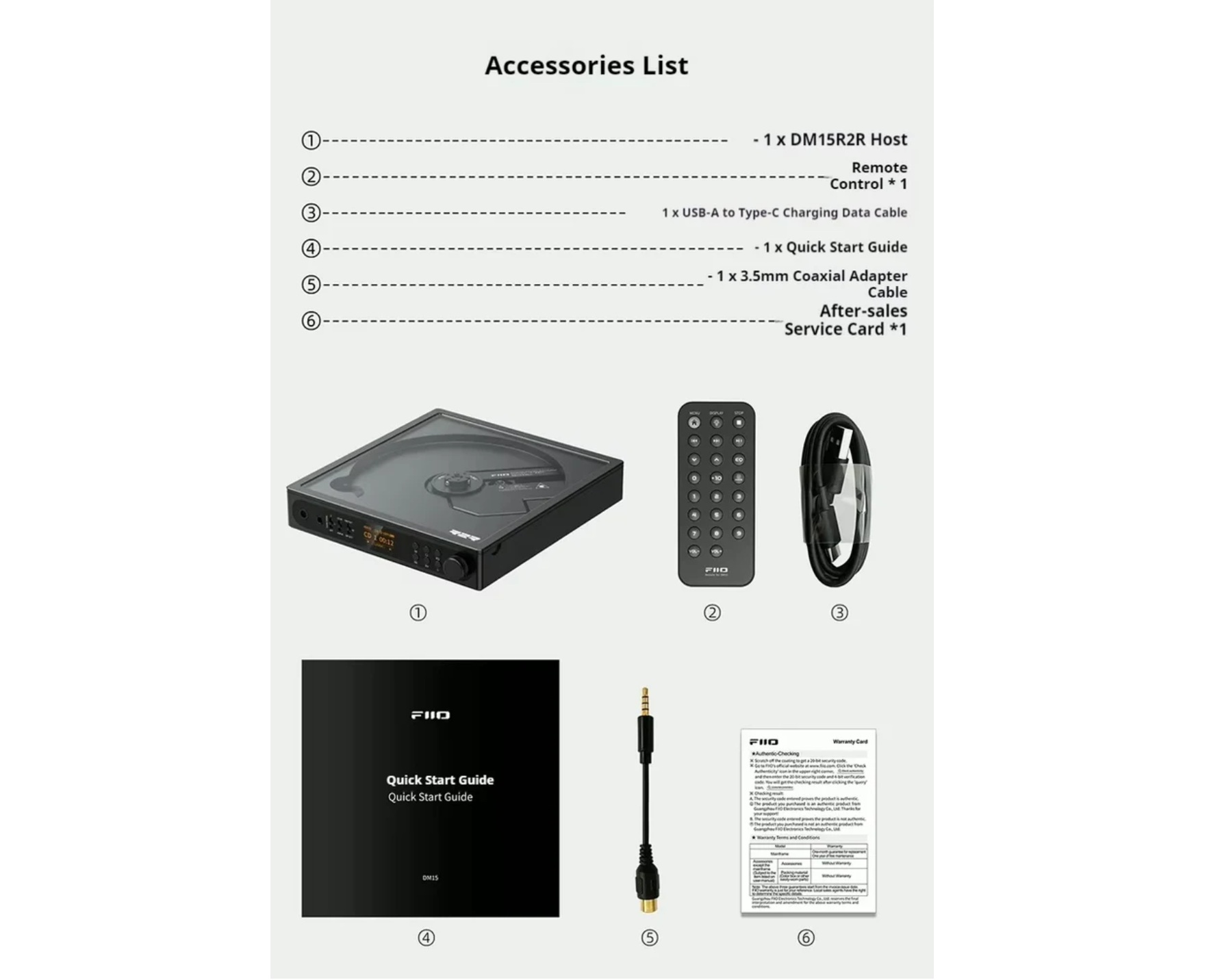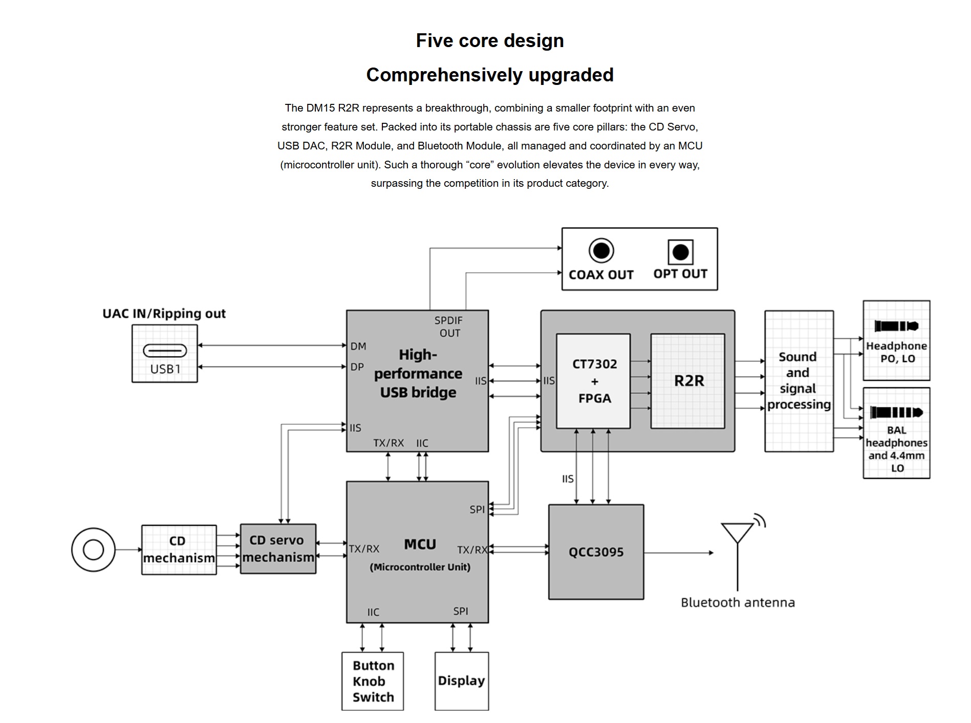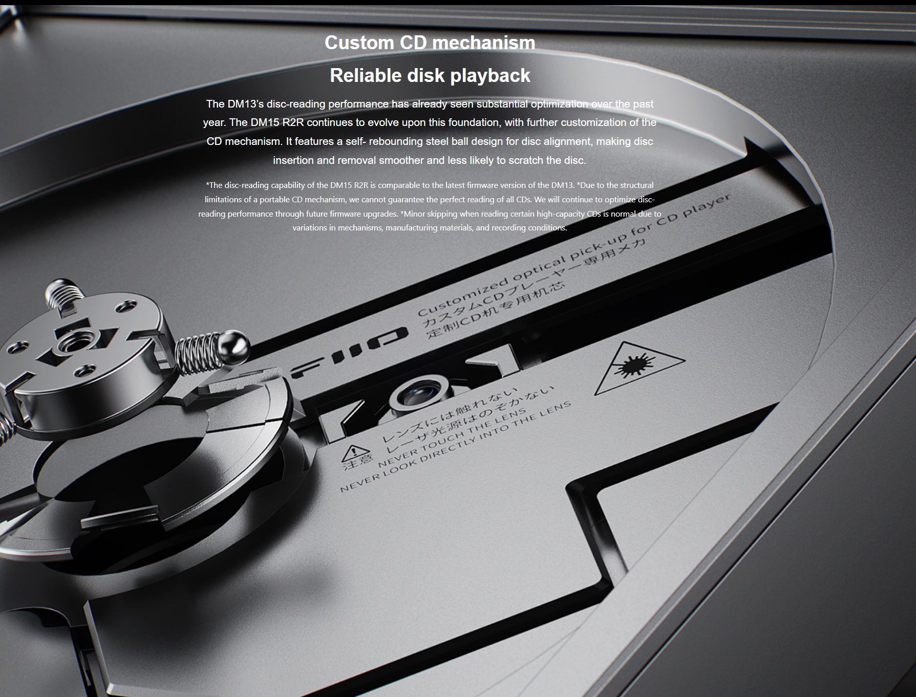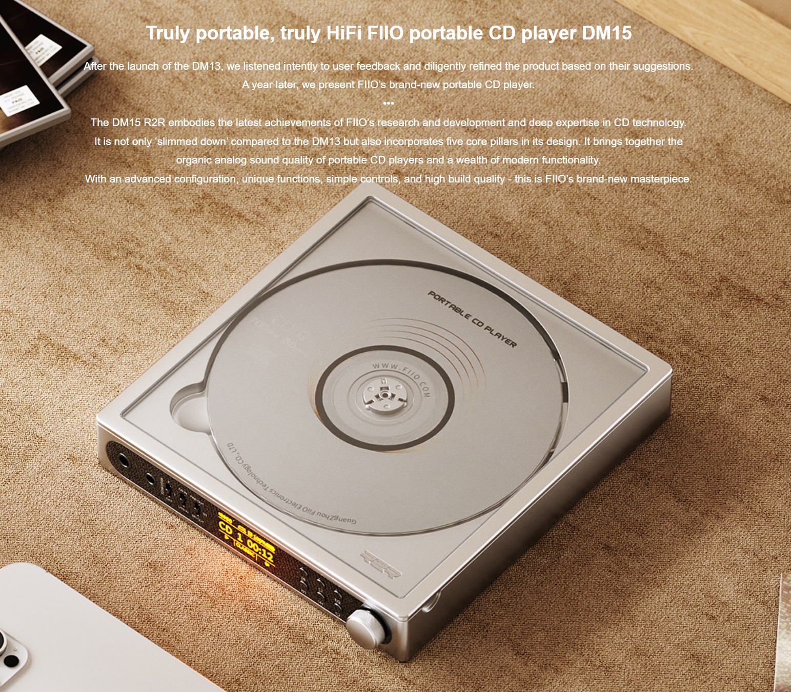 Kasutatavust silmas pidades loodud FiiO DM15 R2R sisaldab retrostiilis oranži TFT-ekraani, mehaanilisi juhtnuppe, infrapunapulti, 24 globaalset heli eelhäälestust, valitavaid BASS-režiime ja ESP-hüppevastast kaitset. Väljundite hulka kuuluvad 3,5 mm kõrvaklappide, 4,4 mm tasakaalustatud kõrvaklappide, 3,5 mm LO ja digitaalsed koaksiaal-/optilised väljundid. Olenemata sellest, kas seda kasutatakse kaasaskantava transpordivahendina, lauaarvuti CD-allikana, Bluetooth CD-voogedastajana või USB DAC-ina, paistab FiiO DM15 R2R silma kui oma klassi kõige mitmekülgsem kaasaskantav CD-mängija.