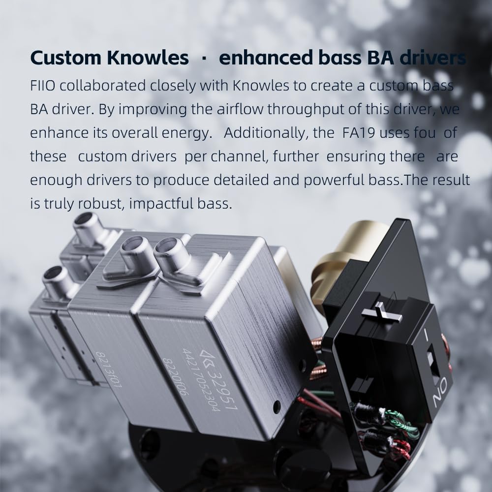 FIIO tegi Knowlesiga tihedat koostööd, et luua kohandatud bassi BA-draiver. Parandades selle draiveri õhuvoolu läbilaskvust, suurendame selle üldist energiat. Lisaks kasutab FA19 nelja sellist kohandatud draiverit kanali kohta, tagades veelgi, et draivereid on piisavalt detailse ja võimsa bassi tekitamiseks. Tulemuseks on tõeliselt jõuline ja mõjus bass.
