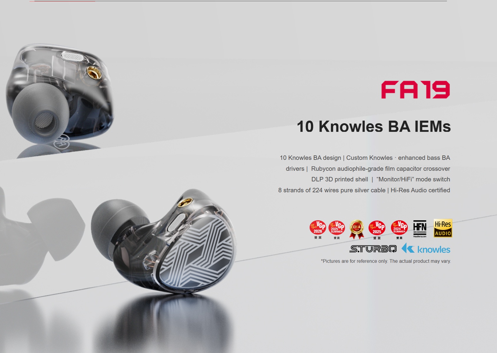 FA19 sees on 10 Knowles'i tasakaalustatud armatuuri draiverit kõrva kohta, mis on mitme draiveri jaoks monumentaalne saavutus.