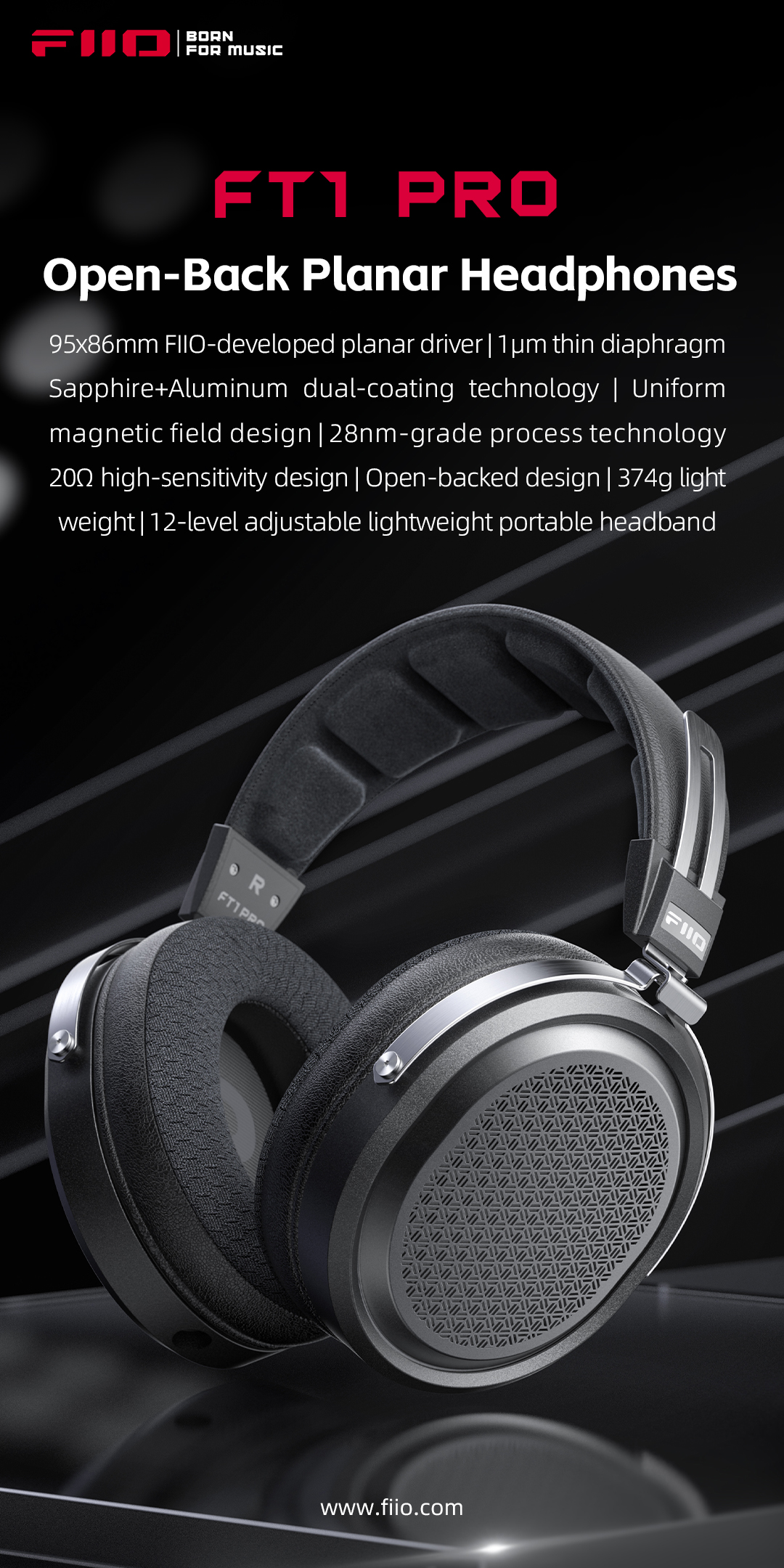 95x86mm FIIO välja töötatud planaarne draiverJätkates FP3 eeskuju, on FT1 Pro varustatud FIIO teise põlvkonna ise väljatöötatud planaarse draiveri tehnoloogiaga. Planaarne draiver on FIIO poolt täielikult disainitud – alates diafragmast, patenteeritud kahekordse katte, juhtivate radade laiuse, magnetahela peenhäälestuse kuni standardiseeritud kinnitusklambriteni – kõik selleks, et tagada tõeline kvaliteetne draiver.Võrreldes tavaliste valmis draiveritega võimaldab ise väljatöötatud draiver täielikult kohandada selle ümber keeruka akustilise süsteemi ehitamist ja sobitamist, muutes selle kergeks ja suurepärase helikvaliteediga.Kuigi FT1 Pro kaalub vaid 374 g, sisaldab see võimekat 95x86 mm draiverit, mille tehnilised näitajad võrduvad lipulaevade planaarsete kõrvaklappide omadega.Tänu põhjalikule uurimis- ja arendustööle pakub FT1 Pro suurt, peaaegu piiramatut helilava, mida leidub harva tema konkurentide seas. Samuti toodab see vaevata heli kuni 40 kHz.1µm õhuke diafragmaIsegi 2µm ja 1µm diafragma paksuse vahe mõjutab märgatavalt jõudlust, kui diafragma vibreerib suure kiirusega, mis omakorda mõjutab helikvaliteeti. FT1 Pro jaoks oleme loonud klassi juhtiva 1µm üliõhukese diafragma, kasutades substraadina kõrge jõudlusega PET-materjali, mis on erakordselt kerge, võimaldades välkkiiret reageerimist. See taasesitab truult isegi peeneid helisid ülisuurel sagedusalal ning pakub erakordset dünaamilist ulatust.Safiiro+alumiinium kahekordse katte patenteeritud tehnoloogiaFIIO FT1 Pro kasutab planaarse draiveri jaoks äsja välja töötatud patenteeritud kahekordse katte süsteemi. Planaarne draiver kasutab substraadina kõrge jõudlusega PET-materjali ning rakendab selektiivselt safiiri ja alumiiniumi, et luua kahekordse kattega draiver.Esimene kattekiht on valmistatud alumiiniumist. Kerge ja juhtiv alumiiniumkate suurendab radade juhtivust, aidates vähendada draiveri takistust ja võimsusnõudeid ning parandada dünaamikat.Teine kattekiht on valmistatud safiirist. Tänu oma suurele kõvadusele suurendab safiirkate diafragma jäikust, parandab kõrgete sageduste lahutusvõimet ja üldist läbipaistvust ning annab draiverile ainulaadse heli lisaboonusena.374g kerge kaalKuigi FT1 Pro-l on suur kahepoolne magnetiline planaarne draiver, kaalub see vaid umbes 374 g – see teeb selle kergeks, mugavaks ja hõlpsasti kaasaskantavaks.20O kõrge tundlikkusega disainKerge FT1 Pro eesmärk on pakkuda suurepärast planaarset heli ilma tõsise võimenduseta. Madal 20O takistus koos kõrge tundlikkusega 112dB/Vrms@1kHz (või 95dB/mW@1kHz) tähendab, et saad FT1 Pro-st hõlpsasti suurepärase heli.FT1 Pro nime päritoluFT1 Pro sai alguse FT1-st, millel on sama välimuse struktuur, kuid oluliselt erinevad sisemised põhikomponendid. FT1 Pro on avatud tagaküljega planaarne kõrvaklapp, samas kui FT1 on suletud tagaküljega dünaamilise draiveriga kõrvaklapp. Mõlemad põhinevad kontseptsioonil "Kerged kõrvaklapid", eesmärgiga luua mugav, kerge ja kergesti juhitav kõrvaklapp. Ilma kaabliteta kaalub FT1 Pro umbes 374 g, FT1 aga umbes 340 g.FT1 on "Kerged kõrvaklapid" sarja standardmudel, samas kui FT1 Pro on sama sarja täiustatud mudel, kus "Pro" tähistab "Progressive" (edumeelne), väljendades "edasiliikumise" või "täiustamise" tähendust.