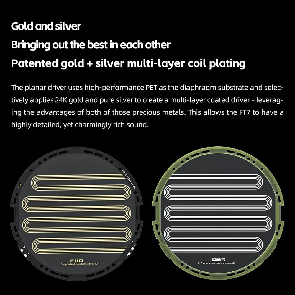 The FT7 employs FIIO’s self-developed planar driver technology— a patented multi-layer coating system. The planar driver uses high-performance PET as the diaphragm substrate and selectively applies 24K gold and pure silver to create a multi-layer coated driver – leveraging the advantages of both of those precious metals. This allows the FT7 to have a highly detailed, yet charmingly rich sound.