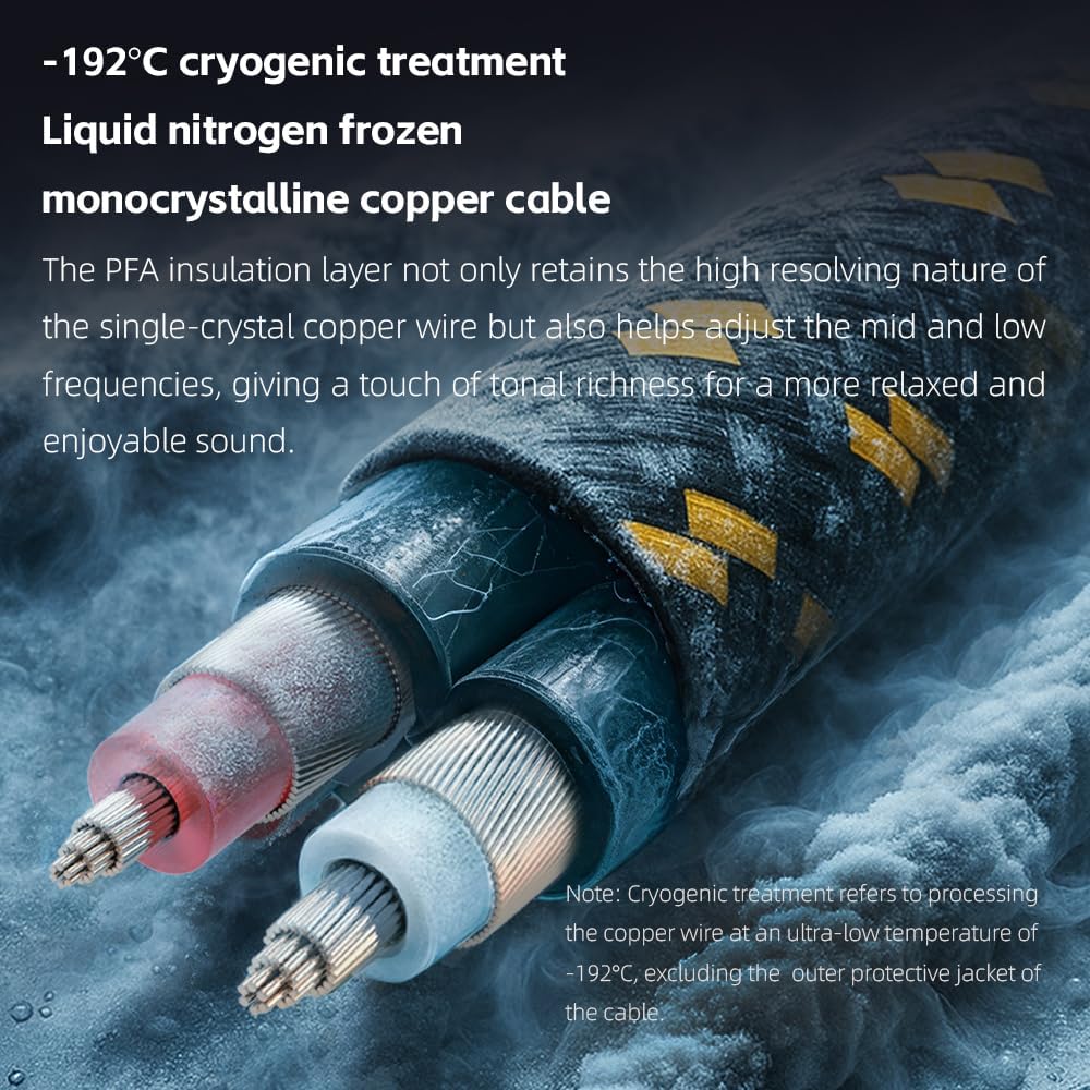 A new cable was specifically crafted and fine-tuned for the FT7 and its sound characteristics. The copper undergoes cryogenic treatment with frozen nitrogen kept at -192°C. This enhances electrical conductivity, signal transmission, and sound clarity. It features a 4.4mm balanced cable design. A 4.4mm to 6.35mm adapter and a 4.4mm to XLR-4 balanced adapter are also included to make the FT7 compatible with popular audio systems.
