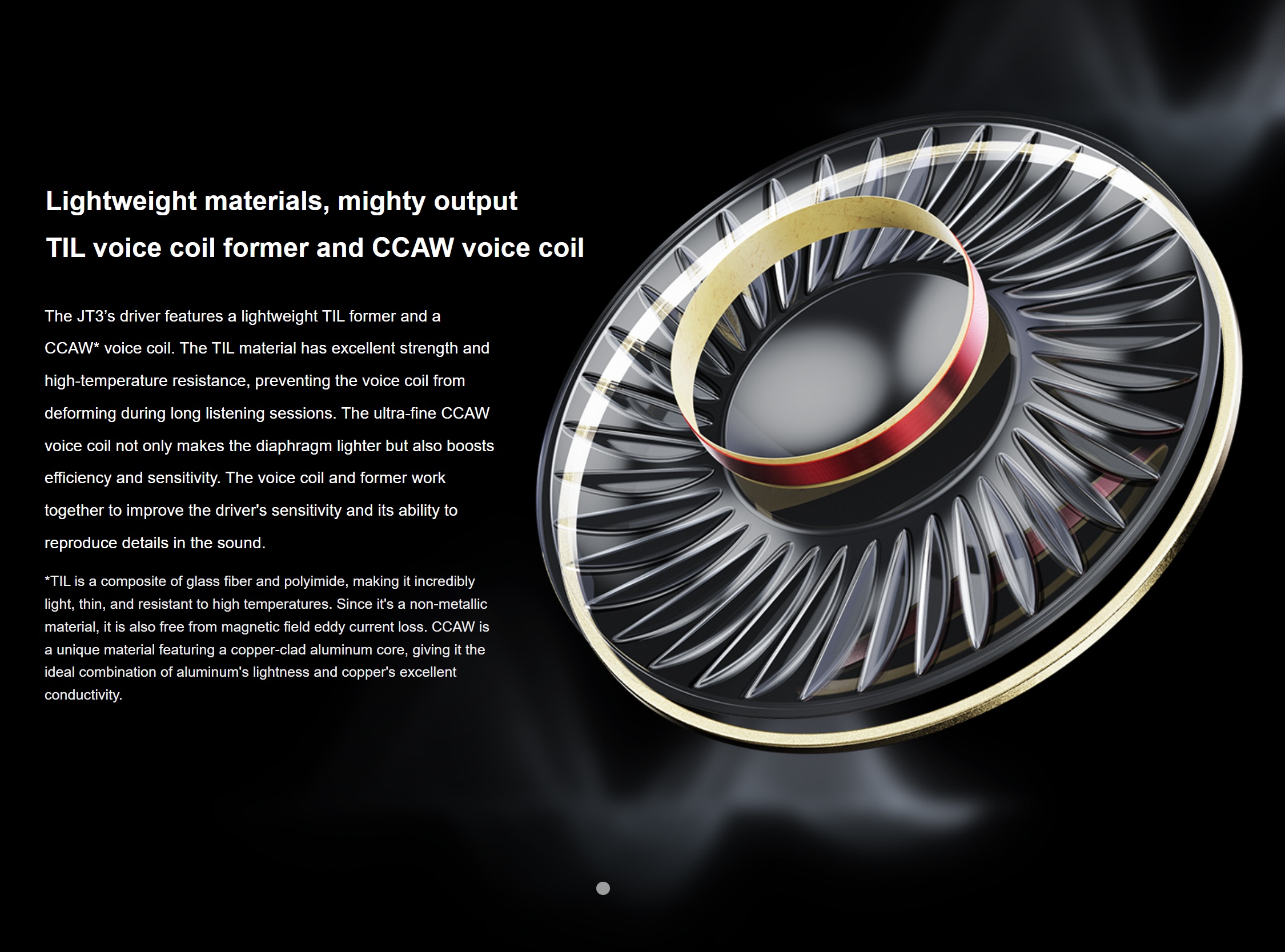 JT3 draiver kasutab kerget TIL-materjalist raami ja CCAW-häälemähist. TIL pakub suurepärast tugevust ja kuumuskindlust, vältides deformatsiooni pika kuulamise ajal.
