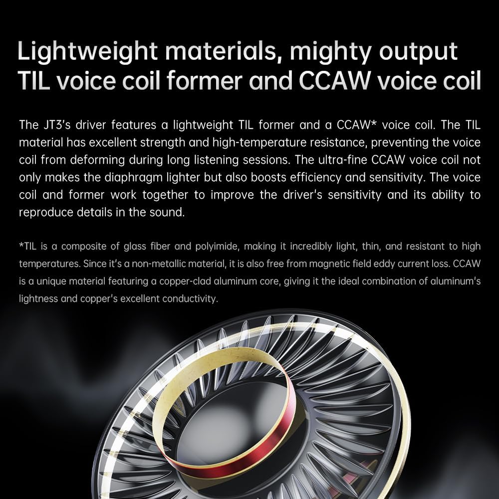 JT3 draiver kasutab kerget TIL-materjalist raami ja CCAW-häälemähist. TIL pakub suurepärast tugevust ja kuumuskindlust, vältides deformatsiooni pika kuulamise ajal.