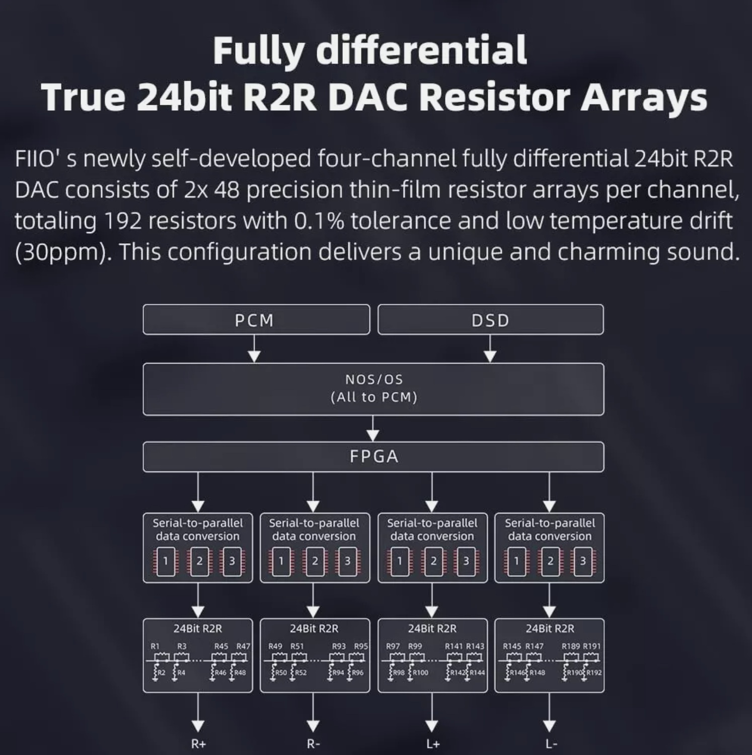 FiiO äsja väljatöötatud täielikult diferentsiaalne 24-bitine R2R takisti massiiv asub K11 R2R keskmes, kasutades 192 ülitäpset takistit 0,1% täpsusega, et tagada erakordne selgus, detailsus ja loomulik helisignaal. Kogege tõeliselt kaasahaaravat kuulamiskogemust laia kõlapinna ja nüansirikka musikaalsusega.