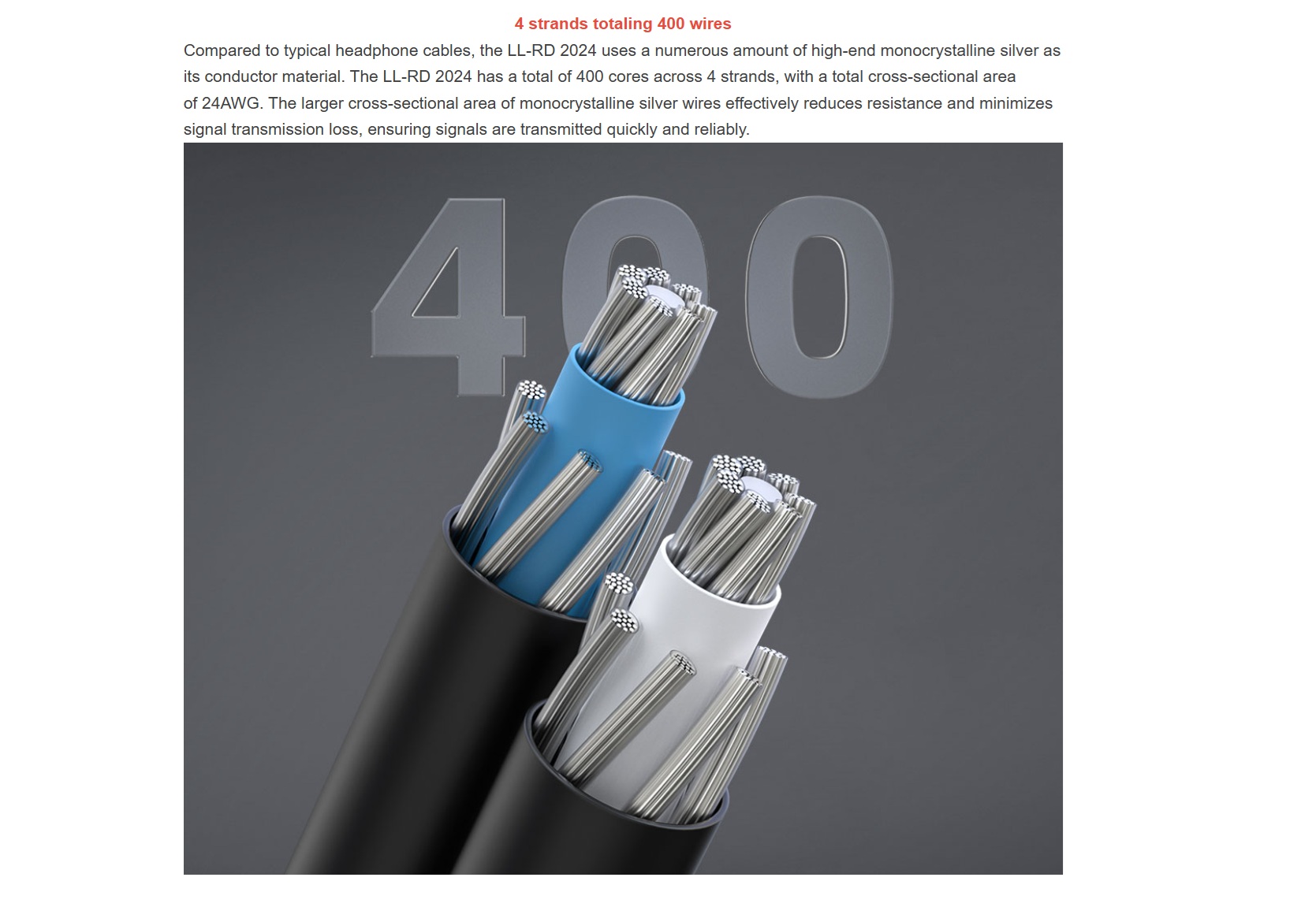 LL-RD 2024 kasutab juhtmaterjalina tipptasemel audiofiilidele mõeldud puhast hõbedat, pakkudes teile läbipaistvamat ja kõrglahutusega kuulamiskogemust. Võrreldes tavaliste kõrvaklapikaablitega kasutab LL-RD 2024 juhtmaterjalina märkimisväärses koguses tipptasemel monokristallilist hõbedat. LL-RD 2024-l on kokku 400 südamikku 4 kius, mille koguristlõikepindala on 24 AWG. Monokristalliliste hõbetraatide suurem ristlõikepindala vähendab tõhusalt takistust ja minimeerib signaali edastuskadusid, tagades signaalide kiire ja usaldusväärse edastamise. Monokristallilise hõbeda kõrglahutusega omaduste paremaks ärakasutamiseks on LL-RD 2024 koaksiaalselt punutud. Iga 4 põhikiust sisaldab 6 väiksemat kiudu, mis koosnevad 14 traadist. Lisaks on igale põhikiule lisatud spetsiaalne väiksem kiud, mis koosneb 16 traadist, mille tulemuseks on kokku 200 südamikku positiivses ja negatiivses pooluses põhikiu kohta. Kõrge puhtusastmega hõbeda kasutamine juhtmaterjalina suurendab juhtivust, parandades helipilti ja eraldusvõimet, olles samal ajal nii läbipaistev kui ka sujuv. Lisaks kasutatakse varjestuskihis sarnast punumistehnikat sama südamike arvuga. See kiht isoleerib juhtmeid välisest mürast, tagades tasakaalustatud ja loomuliku heli. LL-RD 2024 demonstreerib täielikult kõrge puhtusastmega monokristallilise hõbeda eeliseid suurepärase kuulamiskogemuse saamiseks.
