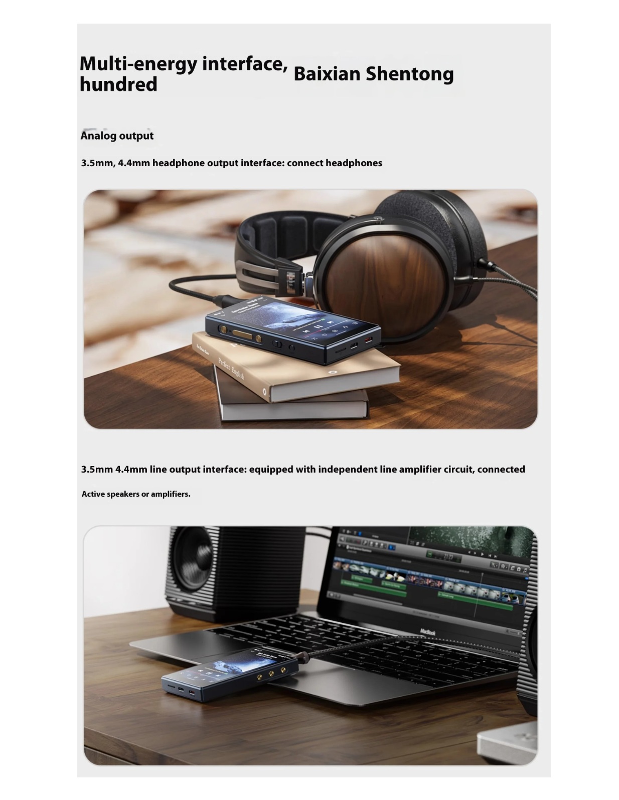 Seadmel on 3,5 mm kõrvaklapiväljund ja balanseeritud 4,4 mm väljund, pakkudes paindlikkust erinevate kõrvaklappidega.