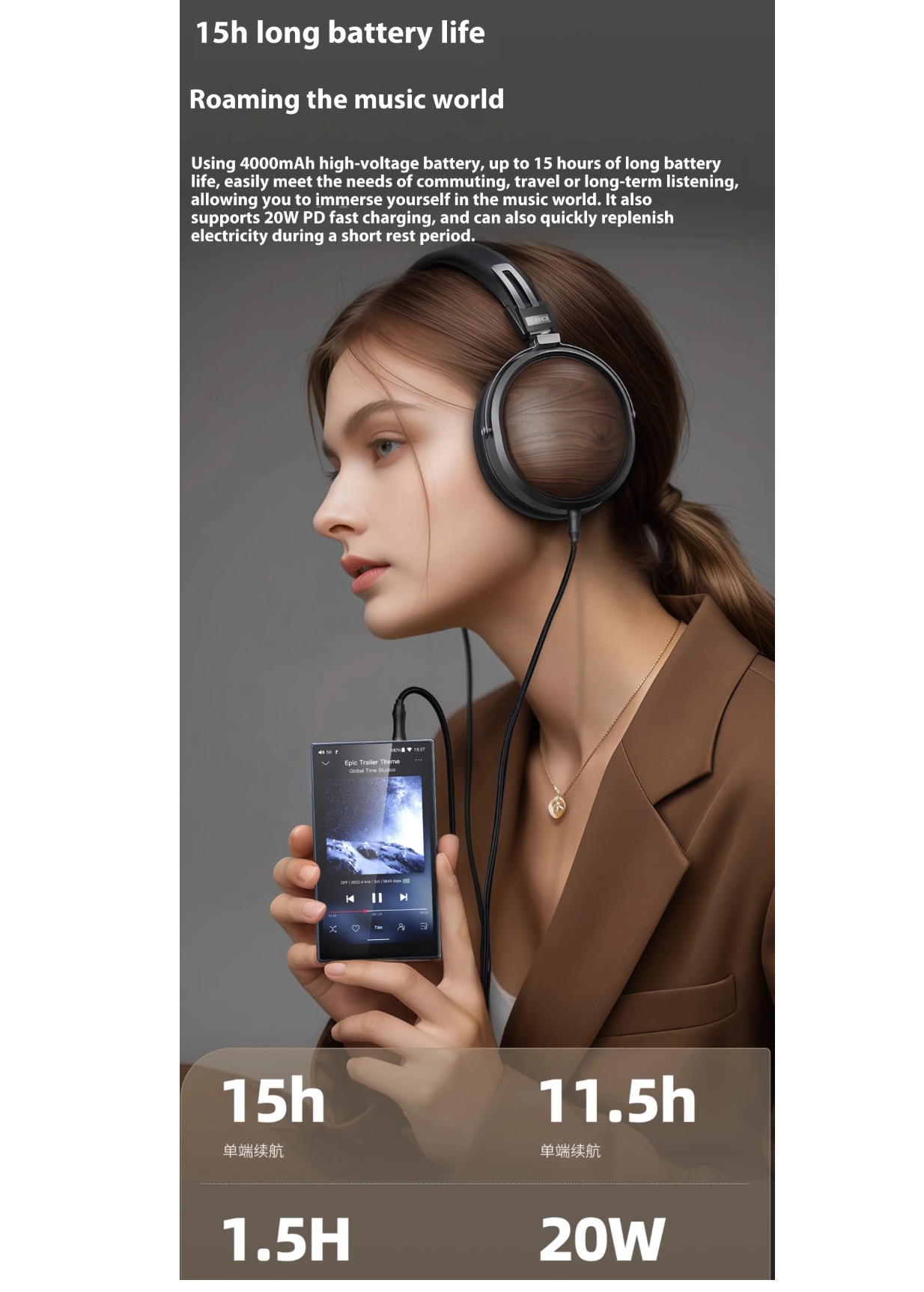 Võimas 4000 mAh aku võimaldab kuni 15 tundi taasesitust ühe kõrvaklapiväljundiga. Kiire USB-C laadimine (Power Delivery tugi) tagab, et mängija on kiiresti taas kasutusvalmis.