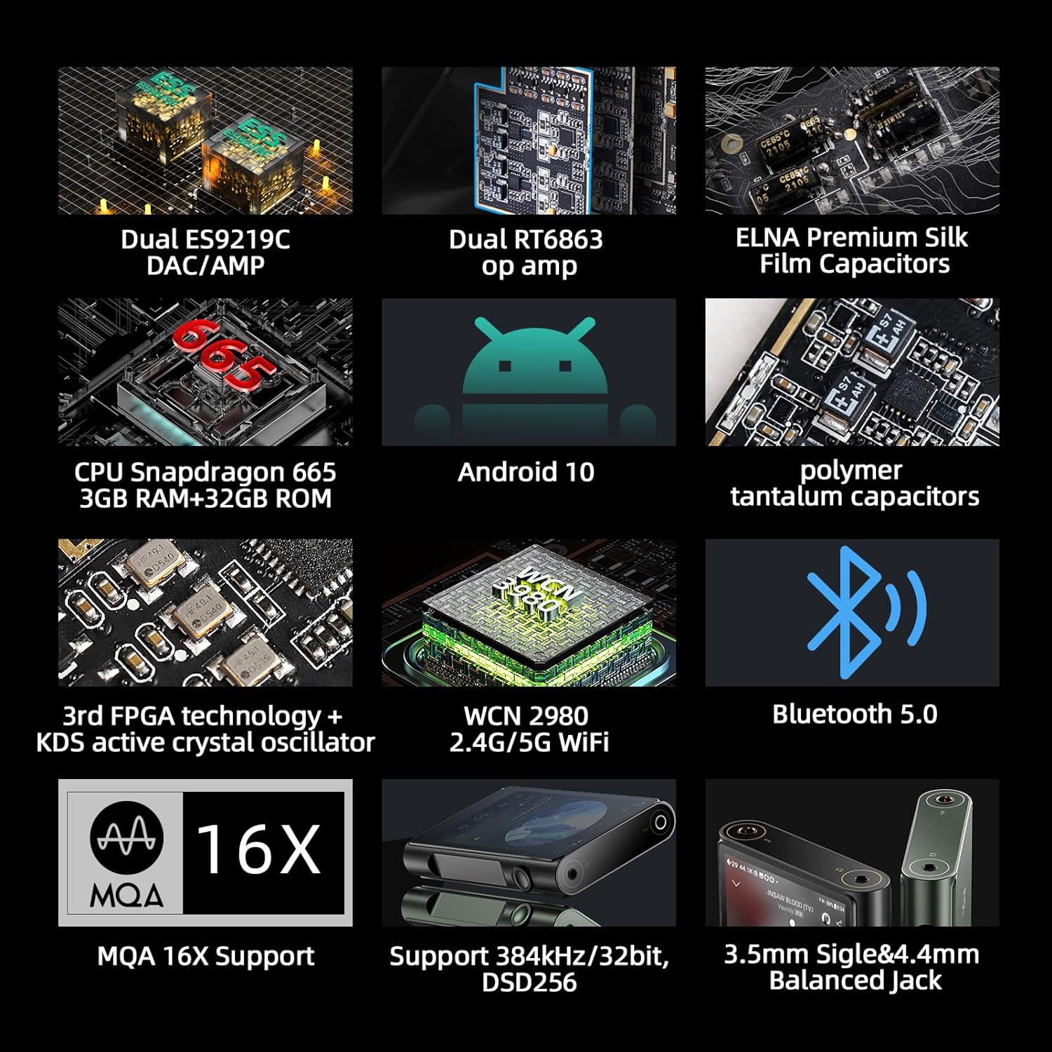 Hi-Res Bluetooth-helimängija, 4,2-tolline LCD-puuteekraan|MQA 16X|2,4G/5G|3500mAh| 3+32GB+2TB skaleeritav|Android 10|Dual ES9219C DAC/AMP|3,5mm ja 4,4mm väljund (must)