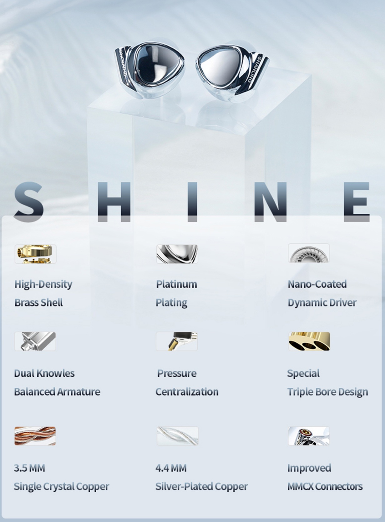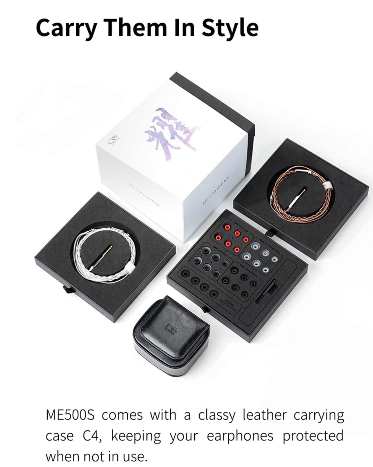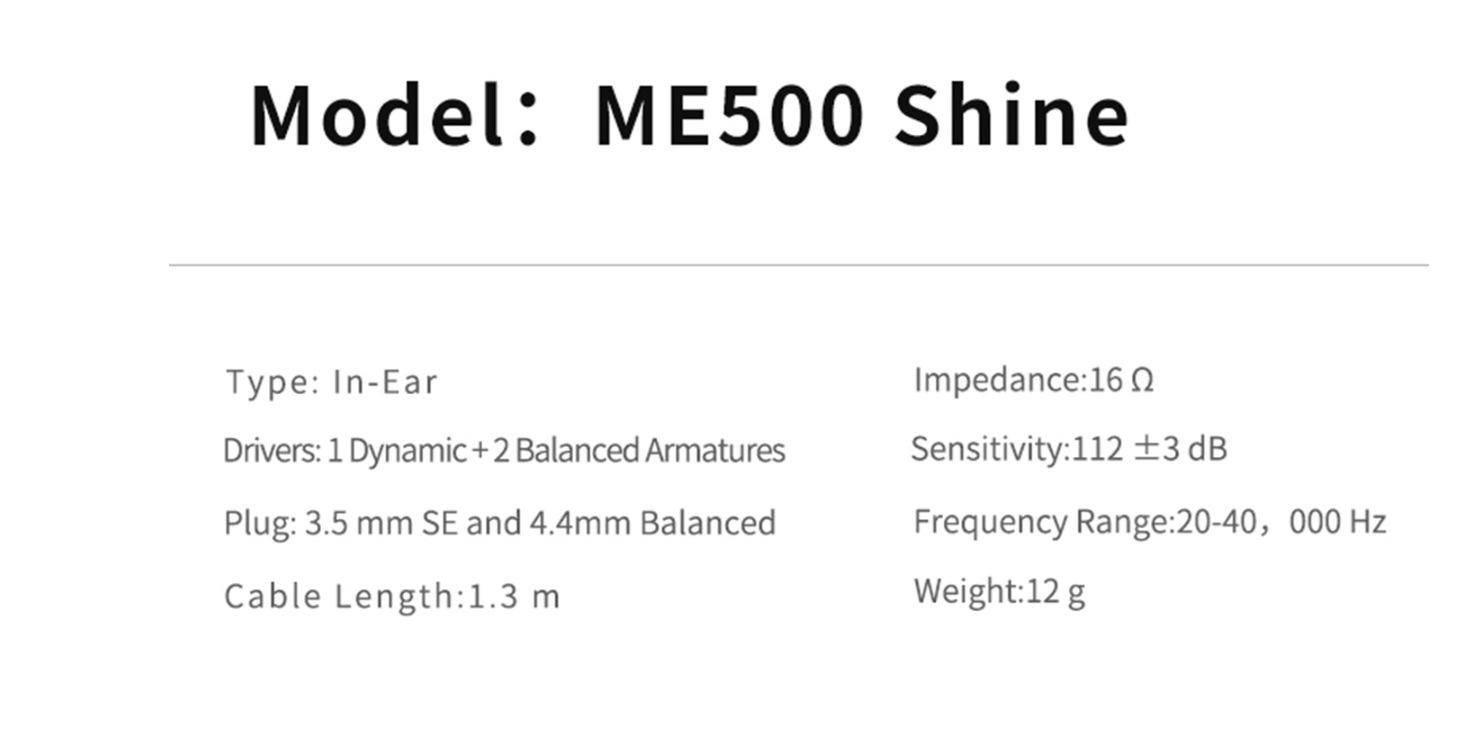 Shanling ME500 Shine on hübriidkõrvaklapid, millel on kokku kolm draiverit, mis esindavad suurepärast ME-seeriat. 10 mm dünaamiline draiver pakub jõulist ja võimsat bassi, samas kui kahekordsed TWFK-30017 BA-draiverid