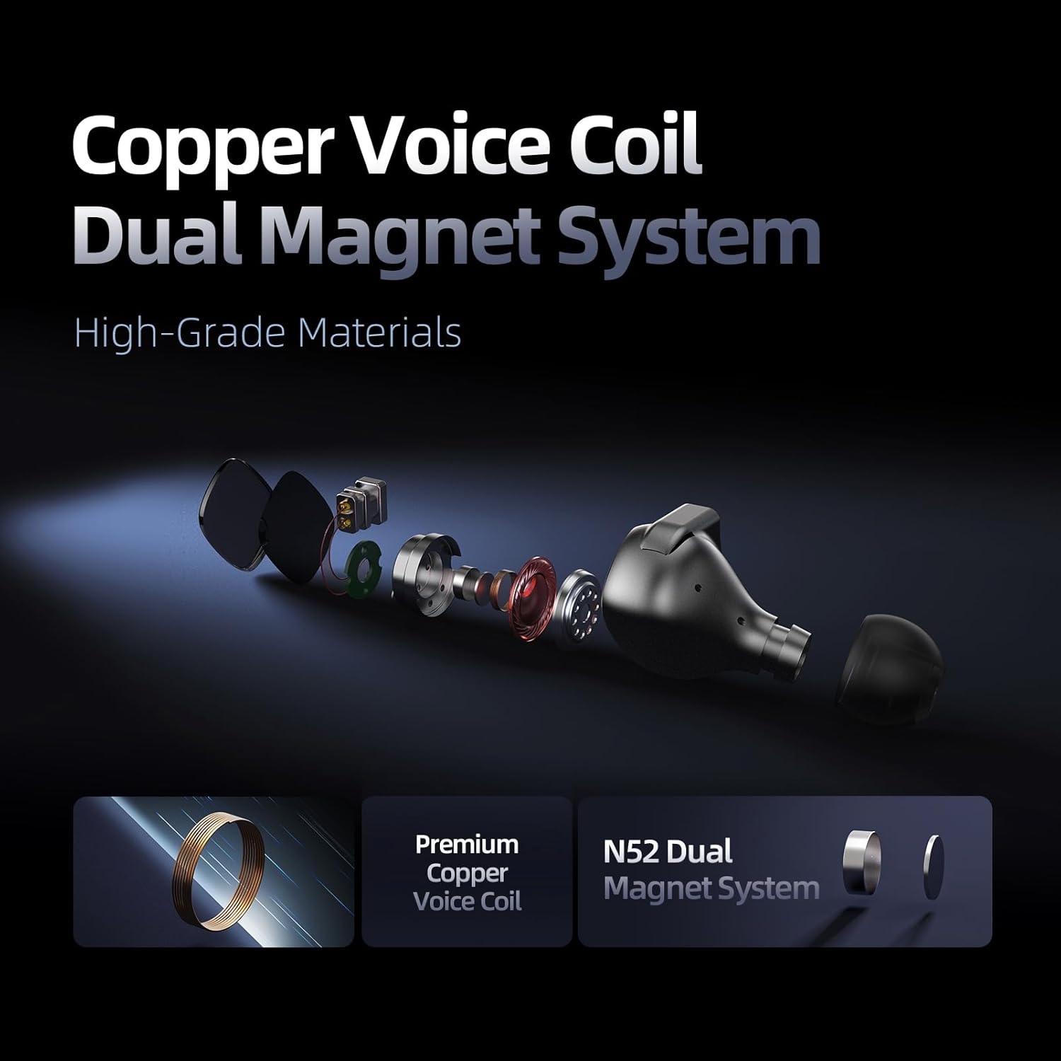 10 mm DLC membraan + N52 kahekordne magnetahel, 0,05% ülimadal moonutus: Innovatiivne 10 mm teemantjas süsinikkiust membraan N52 kahekordse magnetahelsüsteemiga, imporditud vasktraadist mähisega, sageduskarakteristik 20 Hz–40 kHz, kumer õõnsus akustilise jõudluse optimeerimiseks, kõrge eraldusvõimega HiFi helikvaliteet, madalsageduslikud lained, kõrgsageduslik läbipaistev heli.