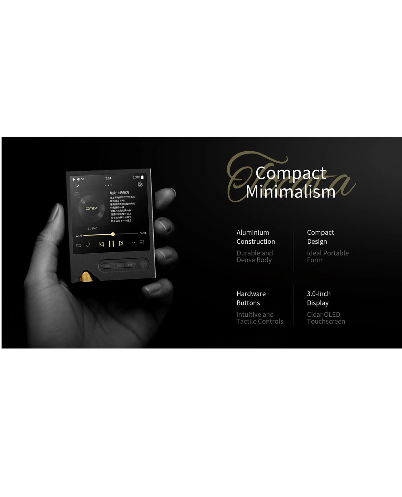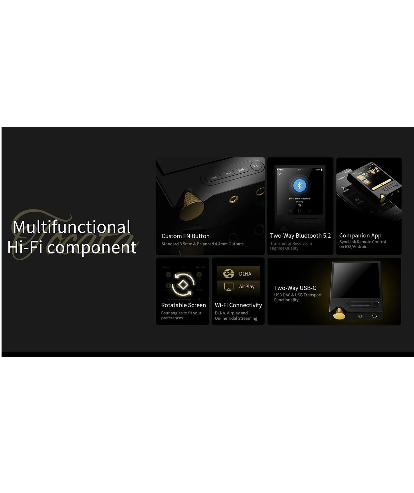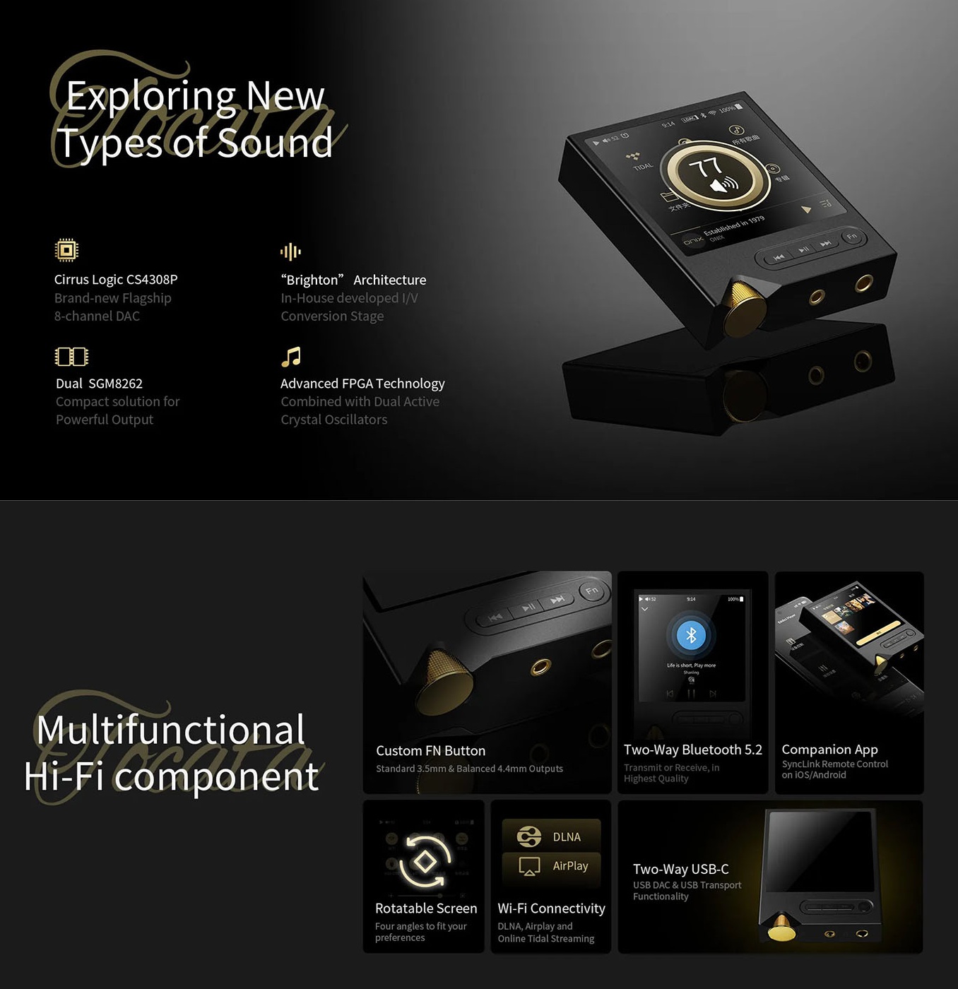 Puhas muusikasüsteemVäga fokusseeritud ja kiire süsteem, mis töötab Ingenic X2000 platvormil ning on loodud ka kõige nõudlikumatele audiofiilidele. Vältides tänapäevaste nutitelefonide segavaid faktoreid, pakub see lihtsalt puhast muusikaelamust. Hi-Res failide esitamine microSD kaardilt, Tidal voogedastus või DLNA/AirPlay kaudu mängimine tagavad katkestusteta kõrgekvaliteedilise (Hi-Fi) heli.