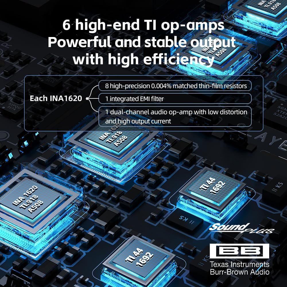 Neli INA1620 kiipi ja kaks OPA1692 madala müra ja moonutusega võimendit tagavad erakordse dünaamika ja vähendavad kanaliüleseid häireid ka rasketes tingimustes.